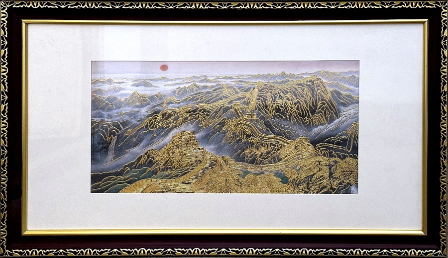 四是南京金线金箔总厂报送的产品名称是《山河锦绣万里长城金箔画》。