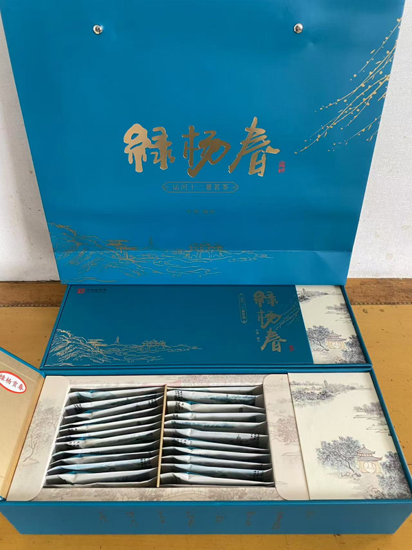 “绿杨春”茶叶在上世纪70年代由国家著名评茶师冯金炜先生主持研制,采摘以一芽一叶初展为标准,芽长在1.8~2.5厘米的范围内,500克干茶需采芽3.8万~4.1万个。绿杨春茶采用有机栽培,绿色防控技术科学化管理,生产工艺经摊晾—杀青—揉捻—辉干—风选等近十道工序精制而成。茶形外形微扁,色泽翠绿,条索细紧,香气如板栗,清芬持久,入杯冲泡后如兰花朵朵绽放,叶底嫩绿舒张,汤色清澈,滋味浓醇鲜爽。“运河十二景"中既有洋溢古镇风情的瓜洲古渡、茱萸湾、邵伯古镇,也有饱含古城神韵的明清古城、盂城驿,还有被誉为湖上胜境的瘦西湖、北湖湿地公园,更有人文高地平山堂、双宁古韵、高旻禅寺和水工匠心的运河三湾、七河八岛。“运河十二景茗茶”旨在将古代文化与现代文明交相辉映形成文创品牌赋能地方特产,推动文旅融合,讲好运河故事,打造扬州“好地方出好茶"这一文旅新概念。