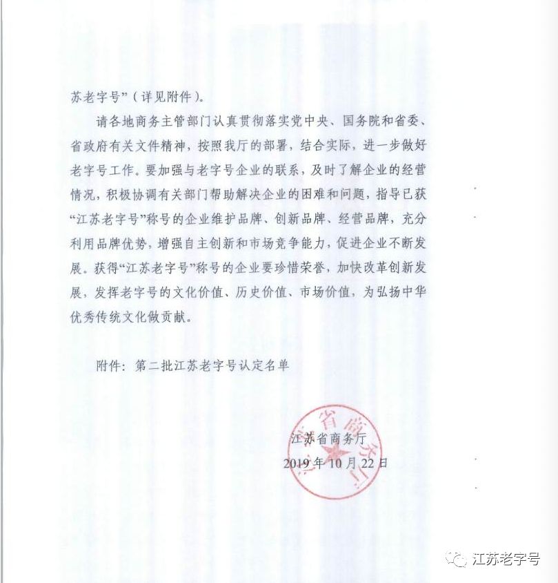 江苏省商务厅关于认定第二批江苏老字号的通知